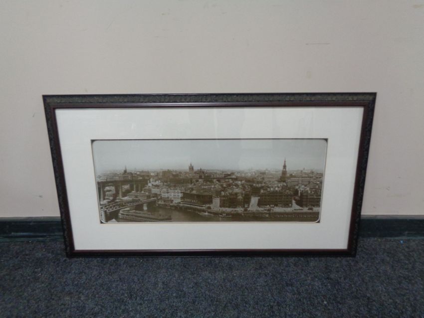 A P. Sanchez oil on canvas, Parisian street scene, together with a framed black and white topographical photo of Newcastle