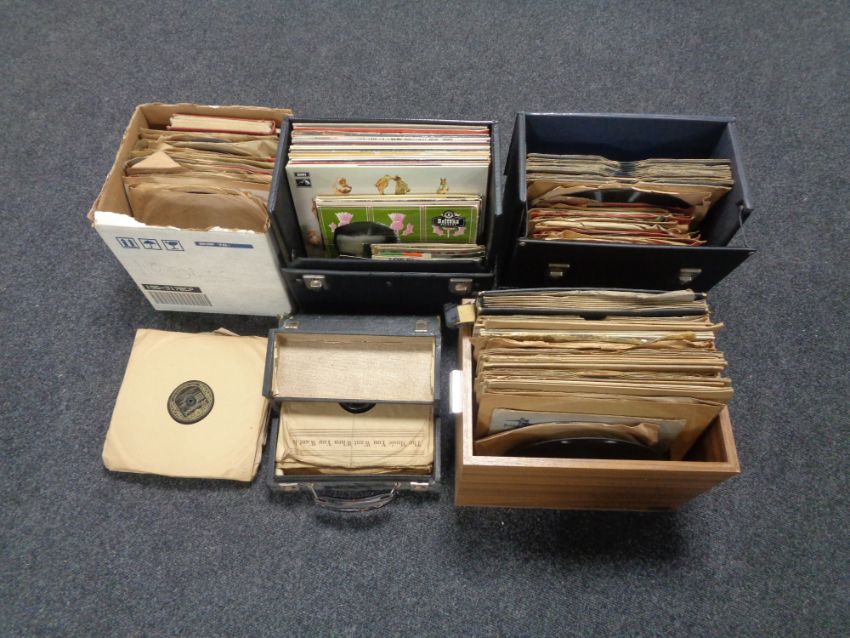 Four cases and a box containing vinyl 78's.