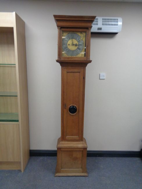 A continental oak longcase clock with brass and metal dial, pendulum and weights