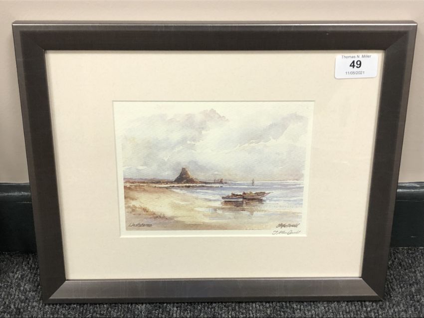After Tom MacDonald : Lindisfarne, reproduction in colours, signed in pencil, 13 cm by 18 cm, framed.