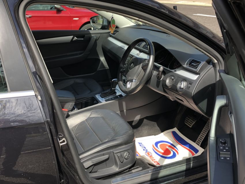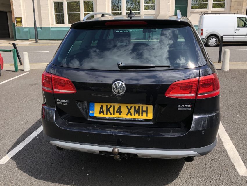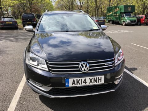 A 2014 Volkswagen Passat Alltrack 2.0 TDI Bluemotion DSG Estate Car, Black, Black Leather Interior, 1968 cc, 33,188 miles, Stop/Start, First Registered 24 June 2014, 2 former keepers showing on V5, with service history, two keys, brand new battery fitted, MOT expired 17 December 2020.