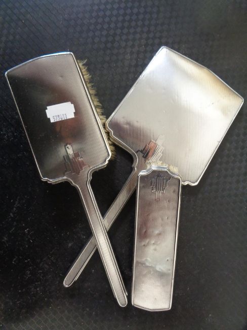 A three piece Birmingham silver dressing table brush and hand mirror set