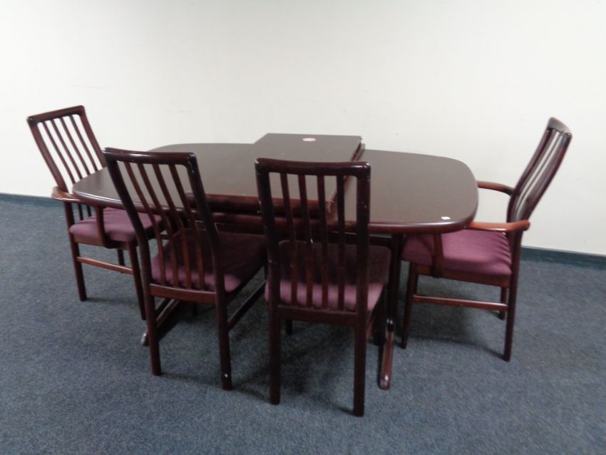 A late 20th century Danish Mobler extending dining table with two leaves and a set of six rail back chairs, two carvers and four singles, in mahogany finish