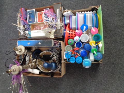 Three boxes of children's drinking bottles and storage jars, table lamps, cash box, jewellery stands etc