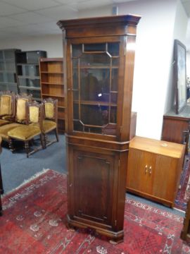 A reproduction Georgian style corner display cabinet, fitted cupboard beneath.