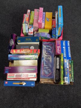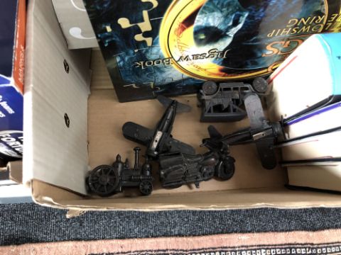 Three boxes of board games, Monopoly, Who Wants to be a Millionaire, Harry Potter books, Lord of the Rings volumes, pencil sharpeners etc