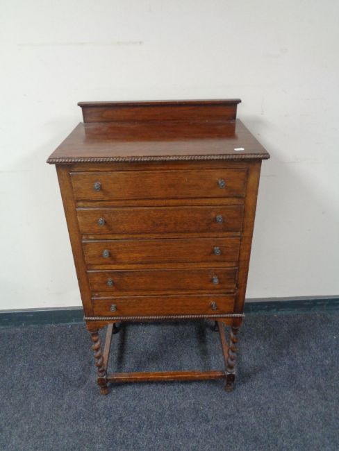 An Edwardian oak five drawer music cabinet on barley twist legs