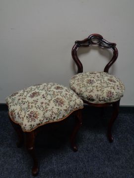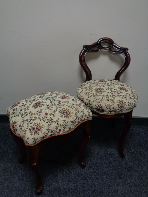 An antique stained beech tapestry seated dressing table chair together with similar footstool