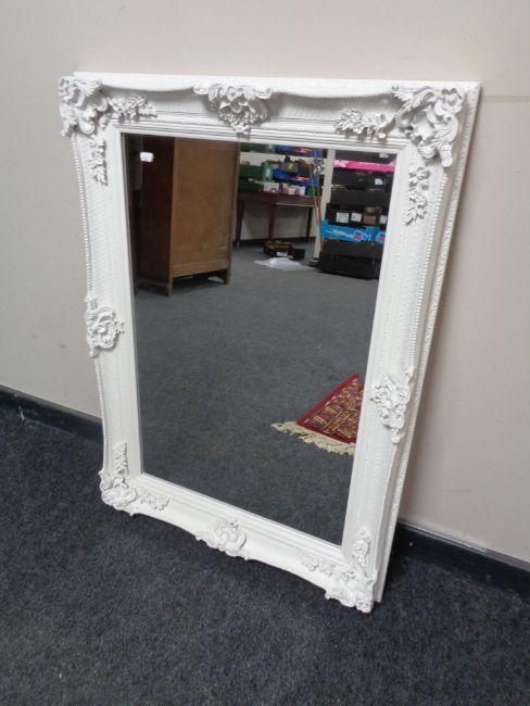 A white ornate painted framed bevel edged mirror.