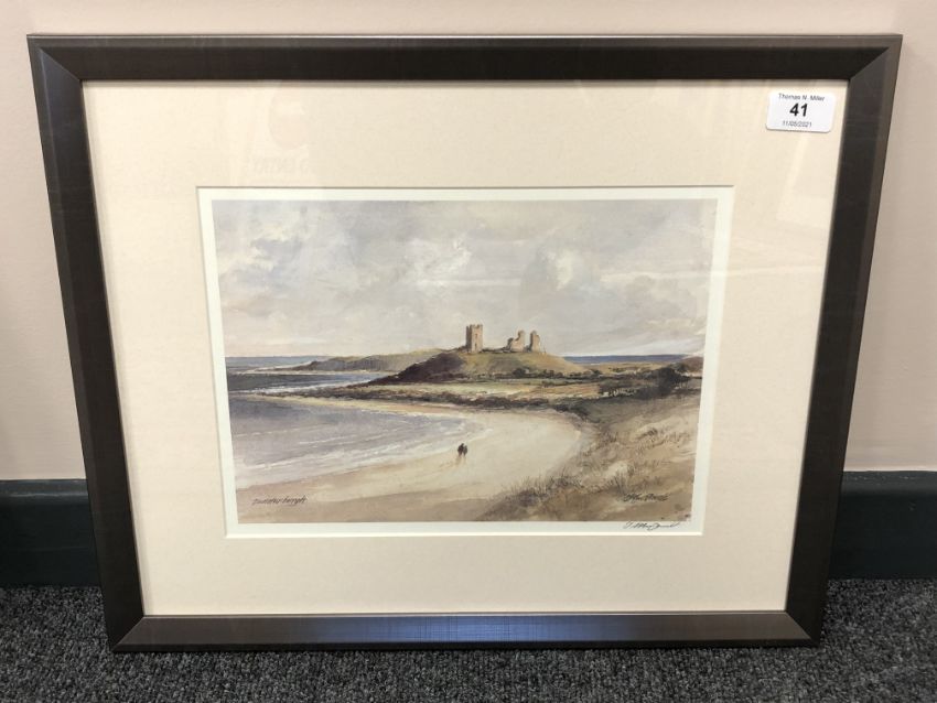 After Tom MacDonald : Dunstanburgh, reproduction in colours, signed in pencil, 21 cm by 30 cm, framed.