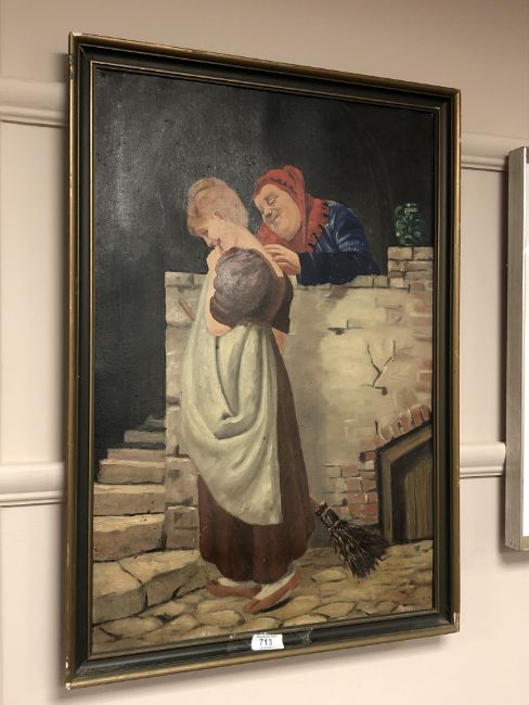 Continental School : Figures by steps, oil on board, 43 cm x 63 cm, framed.