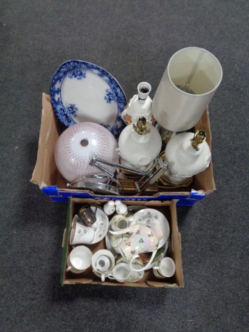 Two boxes of lustre tea service, assorted china, shaving mirror, table lamps, antique blue and white meat plate