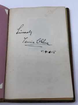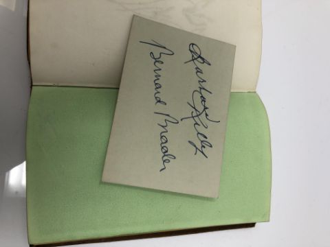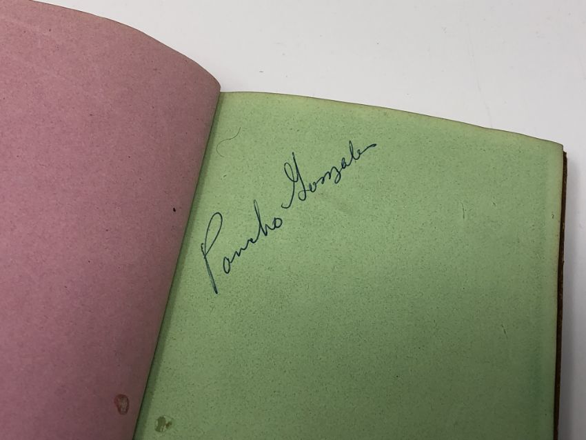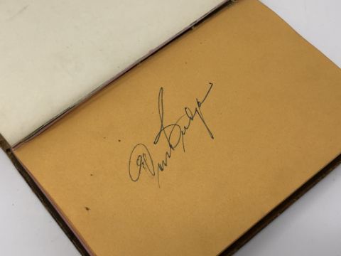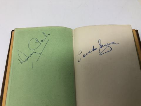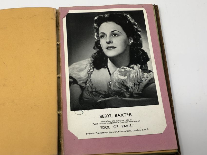 An autograph book containing signatures including Laurel & Hardy, Beryl Baxter and many other illegible signatures.