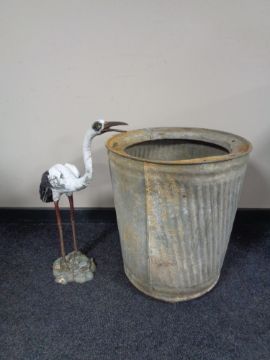 A vintage galvanized wash tub together with a cast metal garden figure of a heron