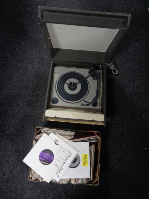 A mid 20th century BSR electric table top record player together with a box containing a large quantity of vinyl 45 singles, 90s etc.