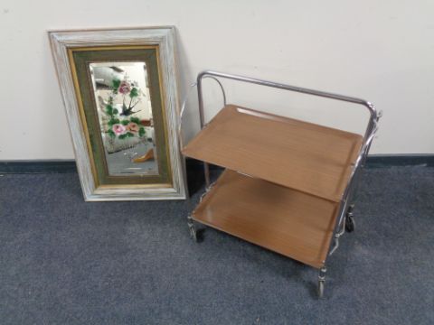 An Edwardian bevelled hand painted framed mirror and a mid 20th century tubular metal folding tea trolley