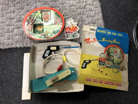 A box containing vintage toys to include Ring Toss and shooting game, wooden blocks, pull along toys, money boxes etc.
