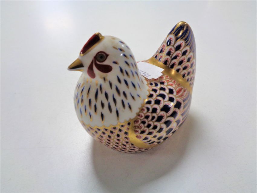 A Royal Crown Derby paperweight of a hen with silver stopper