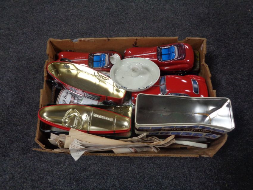 A box containing tins in the form of racing cars, enamel candle stick holder, paper ephemera.