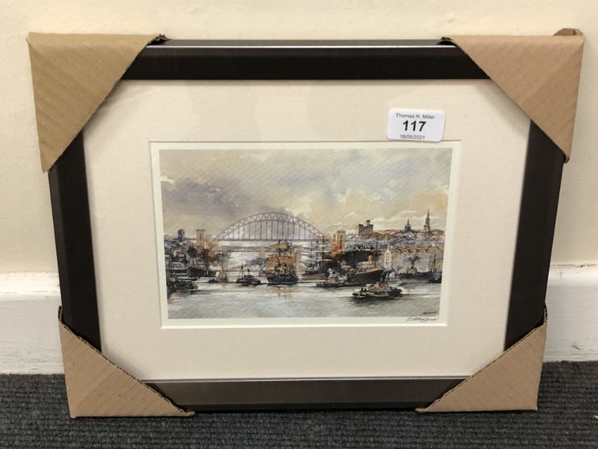 After Tom MacDonald : The Tyne at Newcastle upon Tyne, reproduction in colours, signed in pencil, 13 cm by 18 cm, framed.