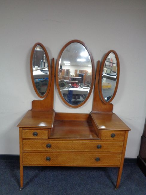 A 19th century inlaid mahogany sunk-centre dressing chest with triple mirror