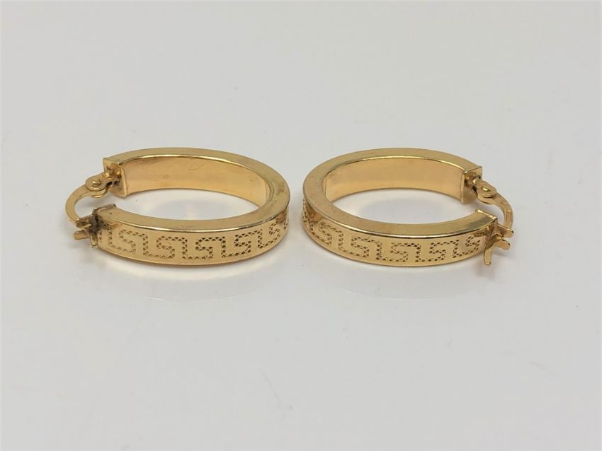 A pair of 9ct gold Greek key pattern hoop earrings.