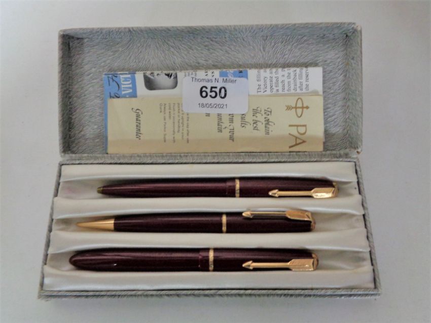 A cased three piece Parker pen set, fountain pen with 14ct gold nib.