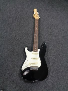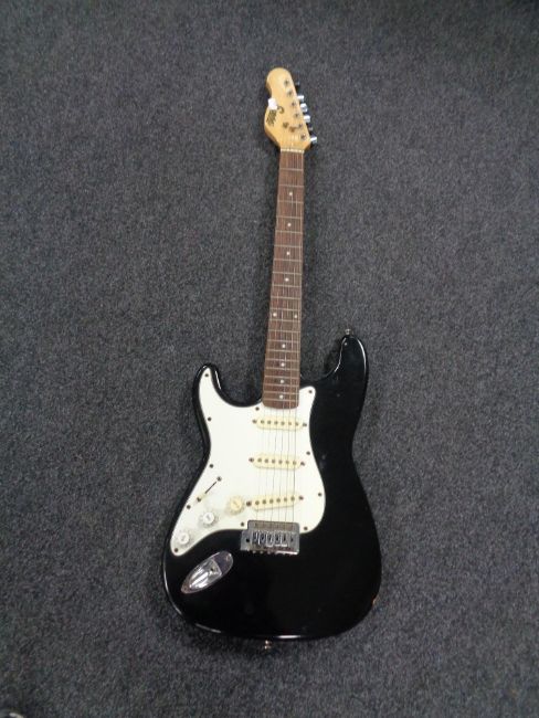 An Encore left-handed electric guitar.