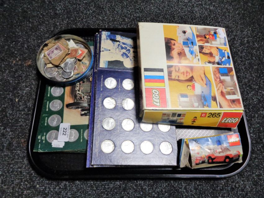 A tray of two boxed Lego sets number 265 and 606, Shell Man in flight and historic cars coin sets, loose stamps and further shell coins