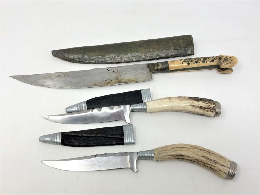 A 19th century Indo-Persian Pesh Kabz, in leather sheath, together with two continental antler-handled knives in leather sheaths. (3)