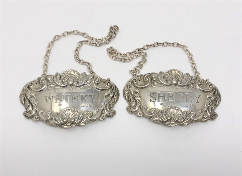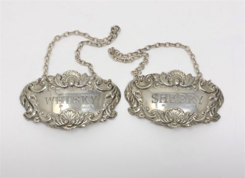 A pair of silver 'Whisky' and 'Sherry' decanter labels, Richards & Knight, London 1971.