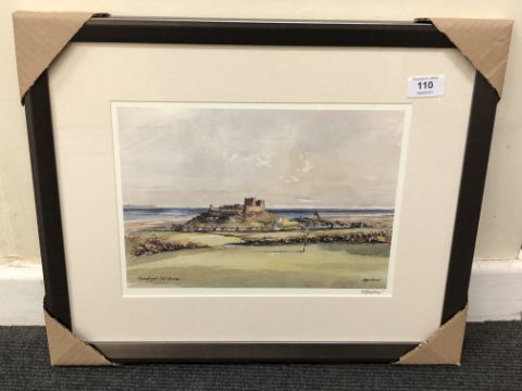 After Tom MacDonald : Bamburgh Golf Course, reproduction in colours, signed in pencil, 21 cm by 30 cm, framed.