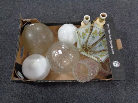 A box containing assorted glass light shades together with a pair of marble table lamps.