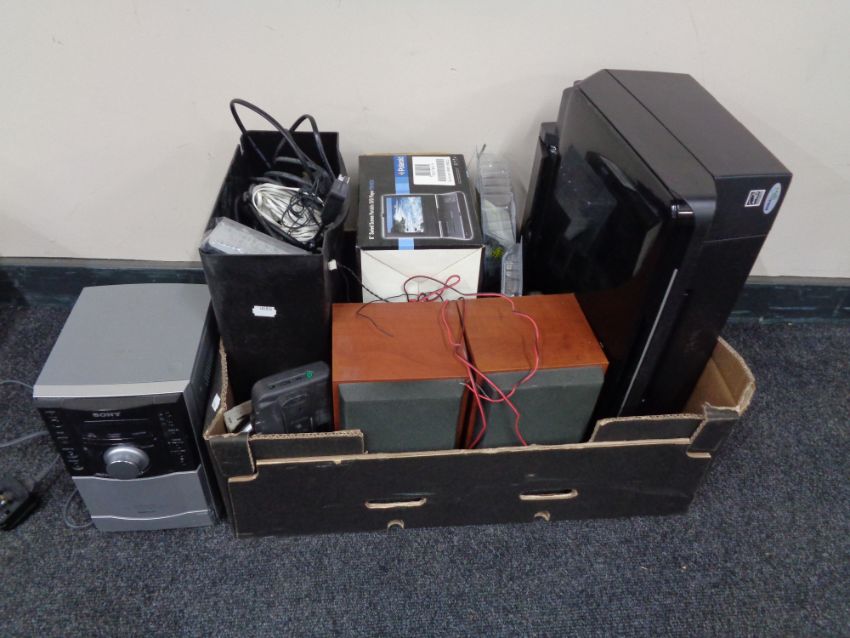 A box of assorted electricals to include Sony micro hifi system, Polaroid 8" portable DVD player, printer, shredder etc