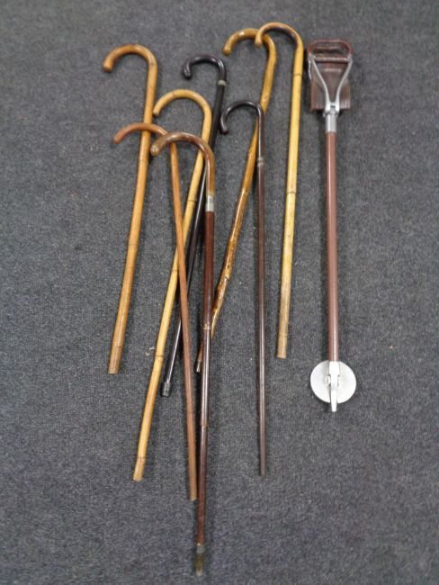 A bundle of eight antique and later walking sticks together with a shooting stick.
