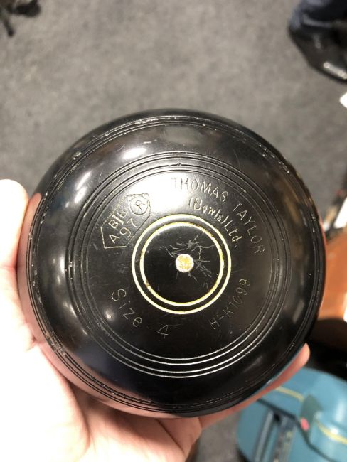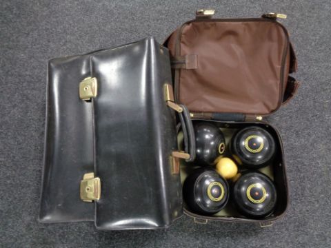 A lawn bowls bag containing four composite Taylor bowls and a leather briefcase