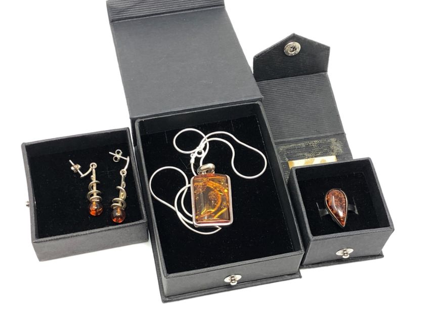A suite of silver and Baltic amber jewellery by Nova Silver, comprising pendant on chain, pair of spiral drop earrings and a ring. (3)