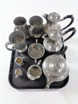 A tray containing antique and later pewter to include James Dickson Cornish pewter tea ware, tankards.