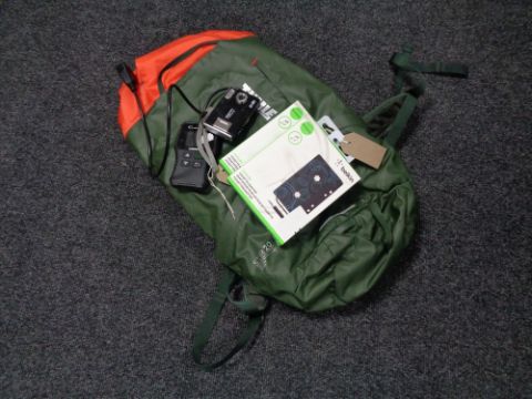 A box containing Belkin cassette adapters, a Thule backpack, Practika camera, together with a Launch Creader 319.
