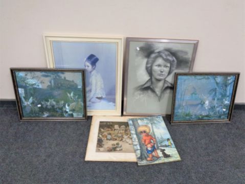 An antiquarian colour print - Mrs Tabather's cats academy, together with five other framed prints
