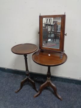 A Victorian inlaid toilet mirror together with two mahogany pedestal wine tables.