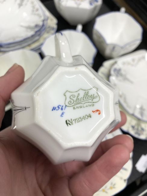 One teacup with and old yellow hairline crack near the base. Another teacup with a more prominent crack/break at the rim. All other pieces appear to be in good order. Some plates have yellowish staining. All have typical surface scratches .