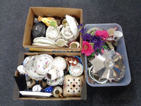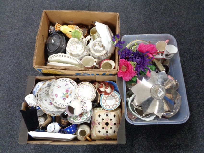 Two boxes and a crate of antique and later china, china ribbon dishes, black Basalt teapot etc