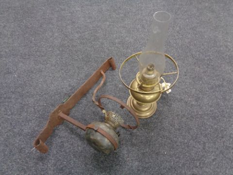 A brass Duplex oil lamp with glass chimney together with an oil lamp with antique cast bracket