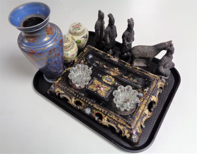 A tray of mother of pearl inlaid papier mache desk stand, pottery figures, Ottoman style figures, ginger jars etc