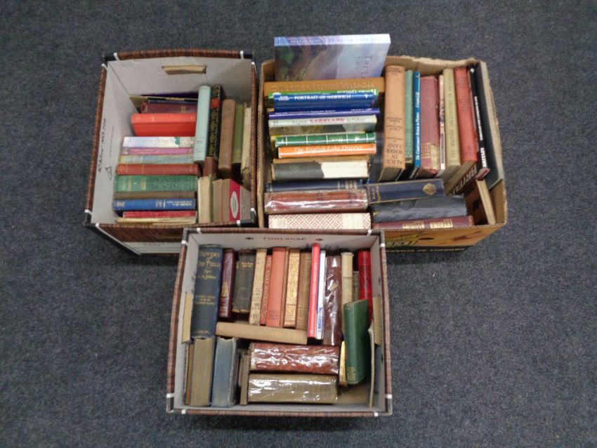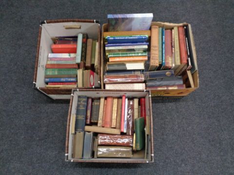 Three boxes of early 20th century and later books to include Alice in Wonderland with colour illustrations, Dickens, Flowers of the Field by Reverend C A Johns