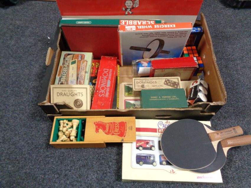 A box of assorted board games, boxwood chess set, draughts, table tennis bats etc