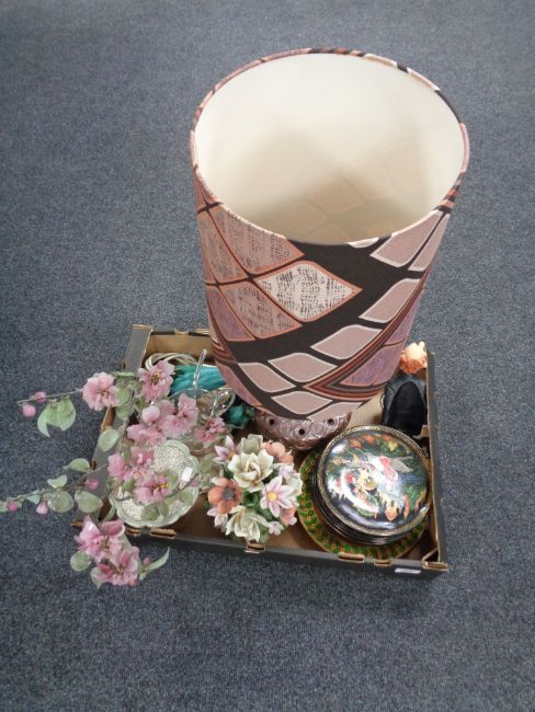 A box of 1970's pottery table lamp with shade, Italian china flower posie, Oriental style wall plates etc
