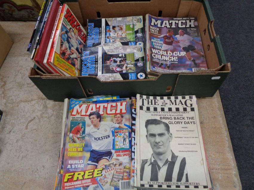 A box containing football annuals, late 20th century Newcastle United programmes, match magazines etc.