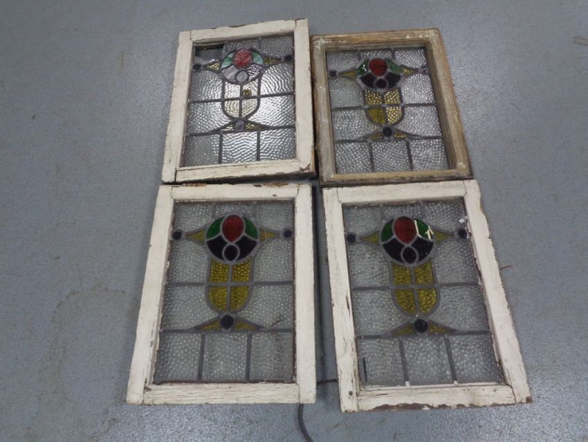 Four stained leaded glass windows in frames.